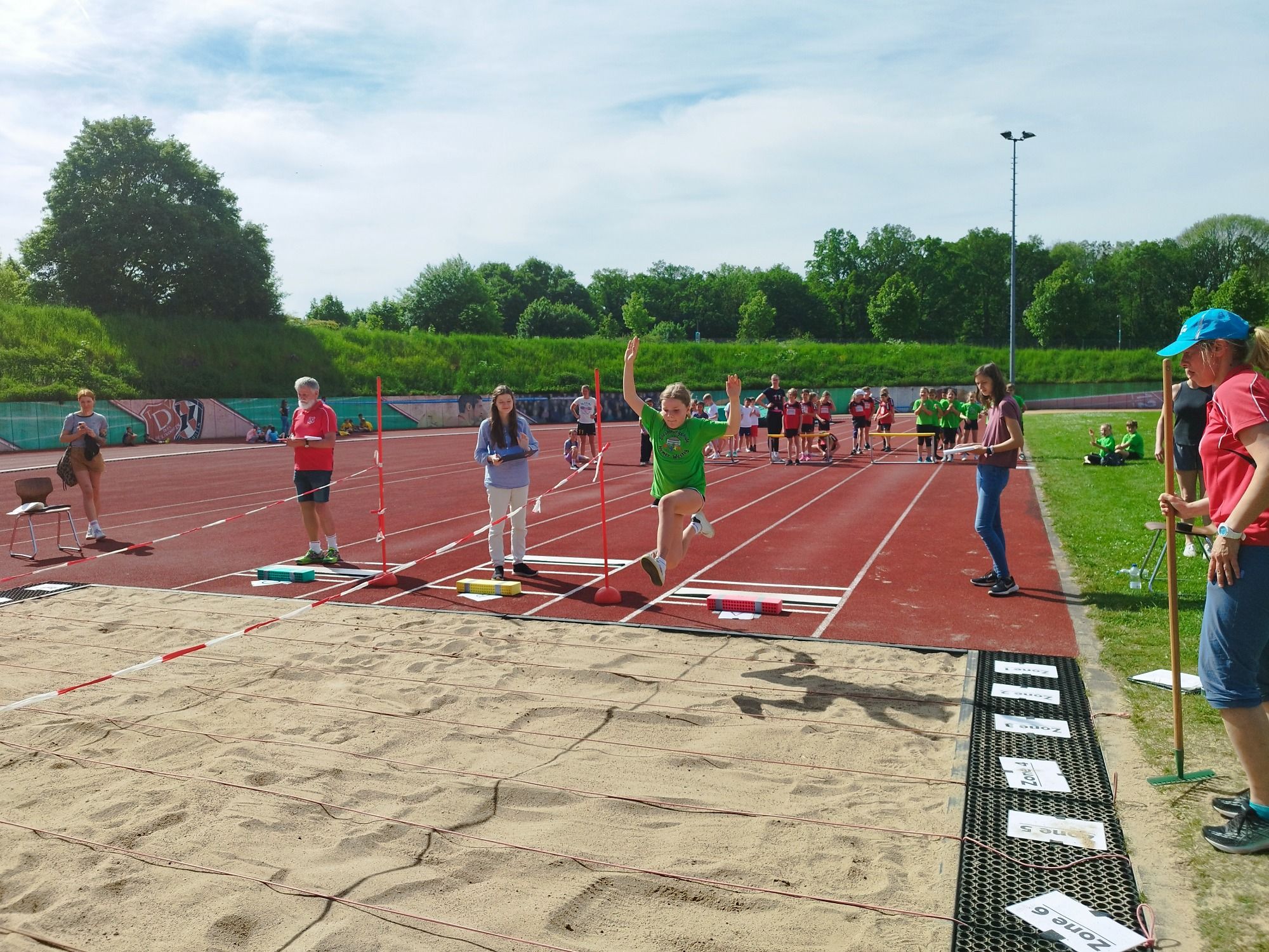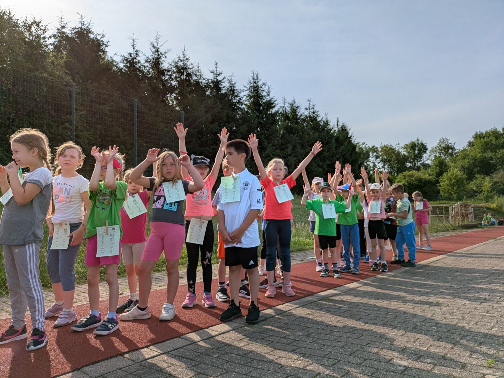 Nachdem unser Spiele- und Sportfest einmal wegen des schlechten Wetters verschoben werden musste, konnten wir es am Mittwoch bei bestem Wetter zur Freude aller nachholen. Zunächst haben sich alle Schülerinnen und Schüler sowie das Team der Diesterwegschule traditionell mit dem Sportinator aufgewärmt. Anschließend wurde gelaufen, gesprungen und gerannt was das Zeug hielt. Bei unseren 4 klassischen Pflichtstationen (Sprint, Weitsprung, Weitwurf und Ausdauerlauf) und 8 Spaßstationen kamen alle Kinder zum Schwitzen und voll auf ihre Kosten. Ein besonderer Dank gilt den Sporthelfern der Europaschule sowie den zahlreichen Elternhelfern!
