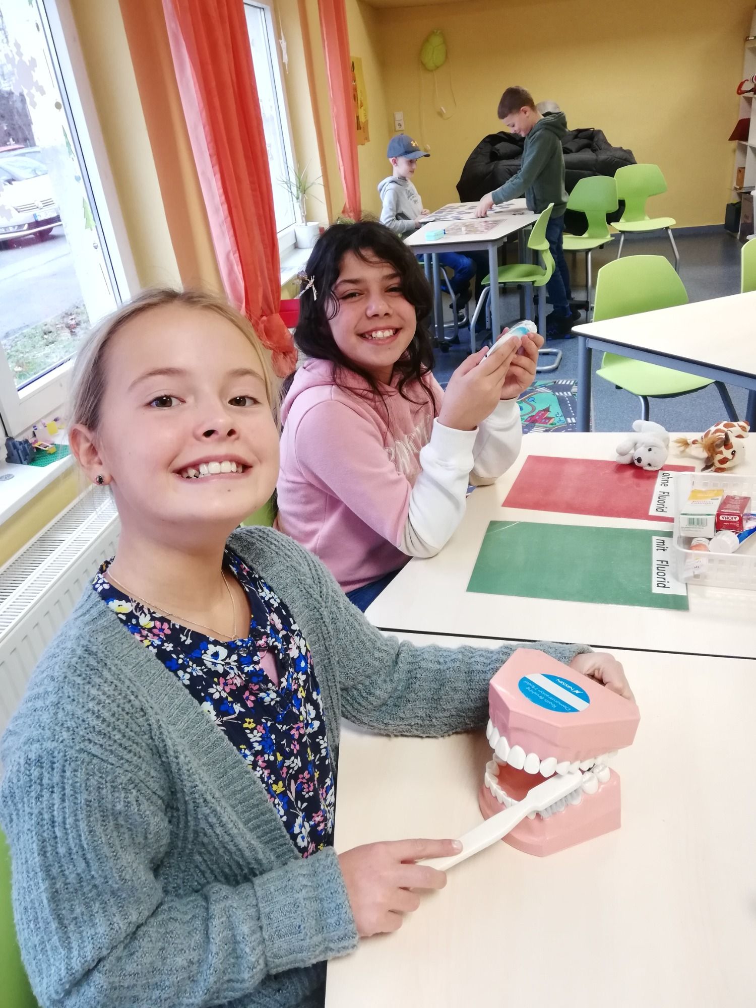 In dieser Woche hatten wir Besuch von Frau Reinhardt. Frau Reinhardt ist Zahnärztin und arbeitet für das Gesundheitsamt. Sie hat viele verschiedene Stationen rund um das Thema Zähne mitgebracht, an denen die Kinder viele interessante Dinge erfahren und lernen konnten. Wir bedanken uns ganz herzlich für das tolle Angebot!