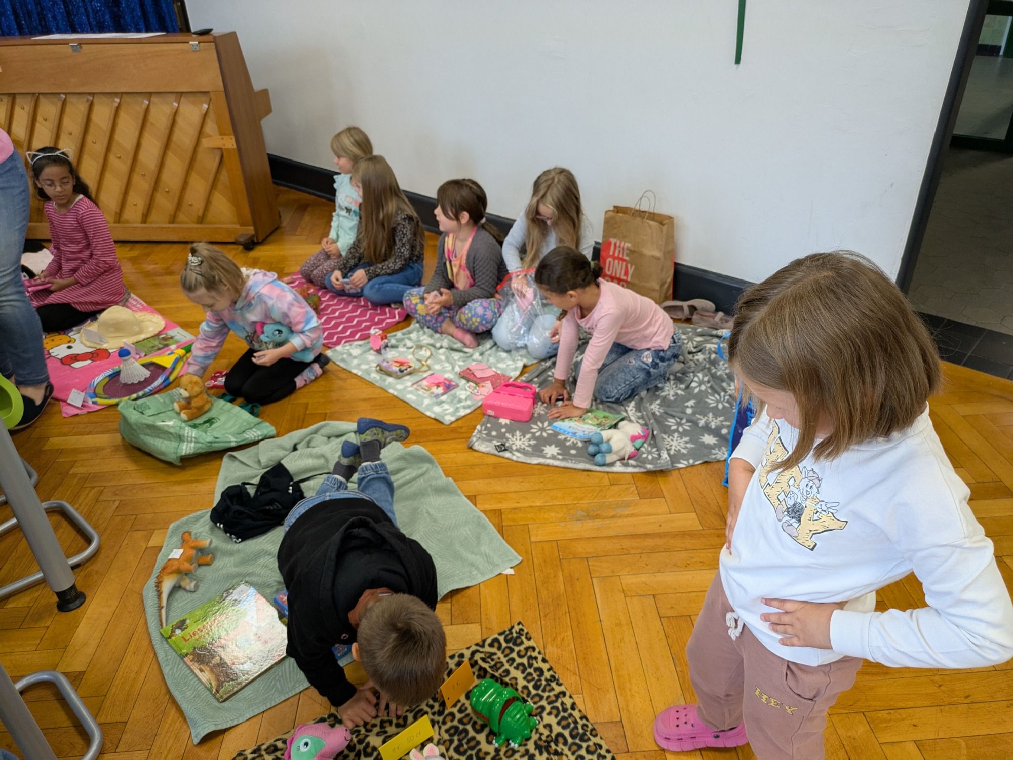 Zum Abschluss der Unterrichtsreihe zum Rechnen mit Geld, veranstalteten die ersten Klassen einen kleinen Flohmarkt. Kleine Spielzeuge, Bücher und Stofftiere wechselten die Besitzer. Am Ende gingen alle Kinder glücklich und mit neuen Errungenschaften nach Hause.