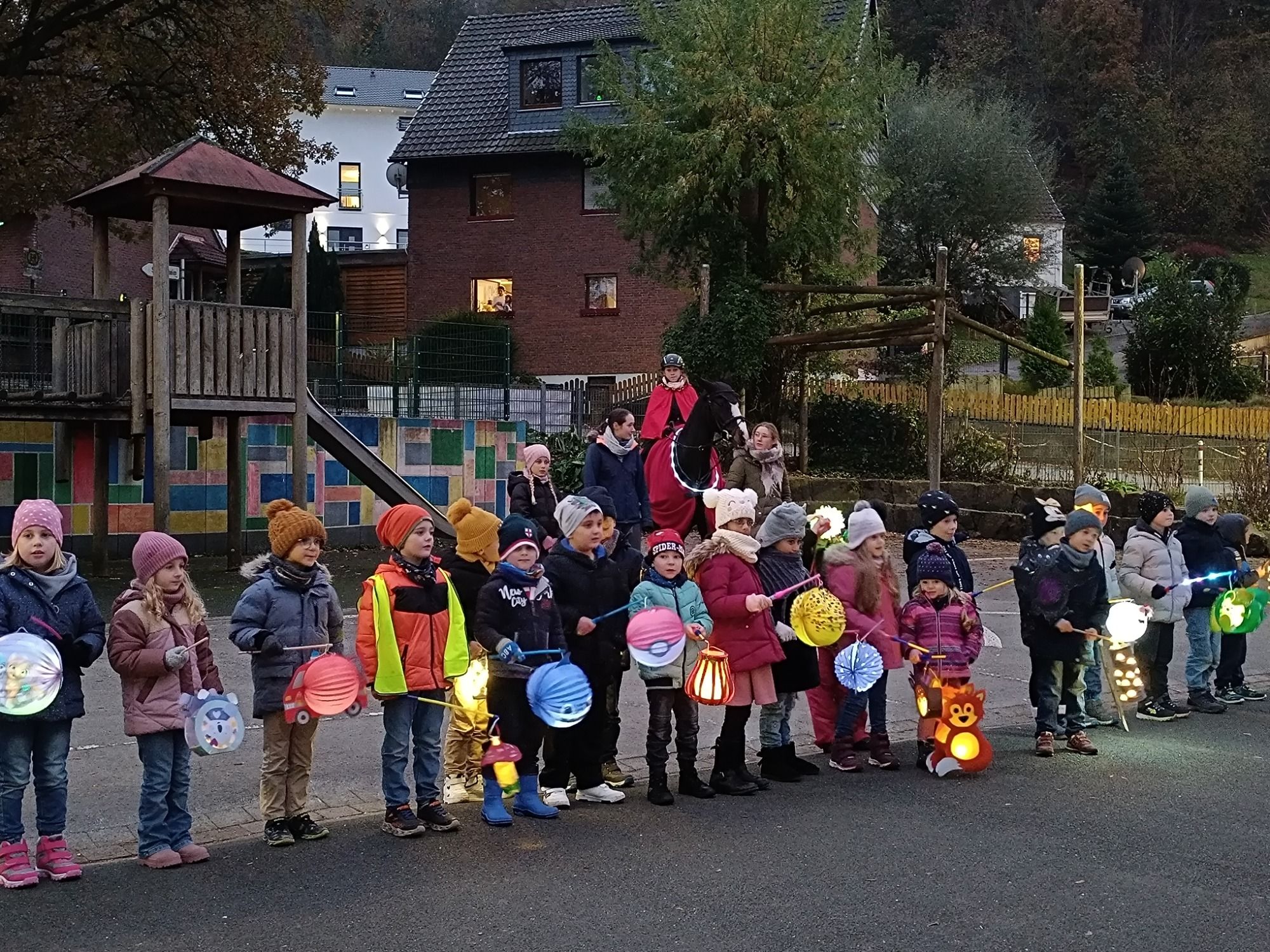Am Dienstag fand das Klassenfest der ersten Klassen statt. Zuerst führten einige Kinder ein Stück zu Sankt Martin vor. Anschließend wurde gemeinsam ein Spiel gespielt. Besonders freuten sich alle Kinder auf den Laternenumzug mit den selbstgebastelten Laternen. Das Highlight war natürlich das echte Martinspferd.