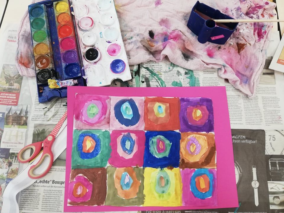 Die Mäuseklasse hat sich im Kunstunterricht mit dem Künstler Wassily Kandinsky beschäftigt. Nachdem die Kinder zunächst einige seiner Werke genau unter die Lupe genommen haben, wurden die jungen Künstlerinnen und Künstler selbst aktiv. Das Werk "Konzentrische Kreise" wurde von den Kindern umgesetzt.