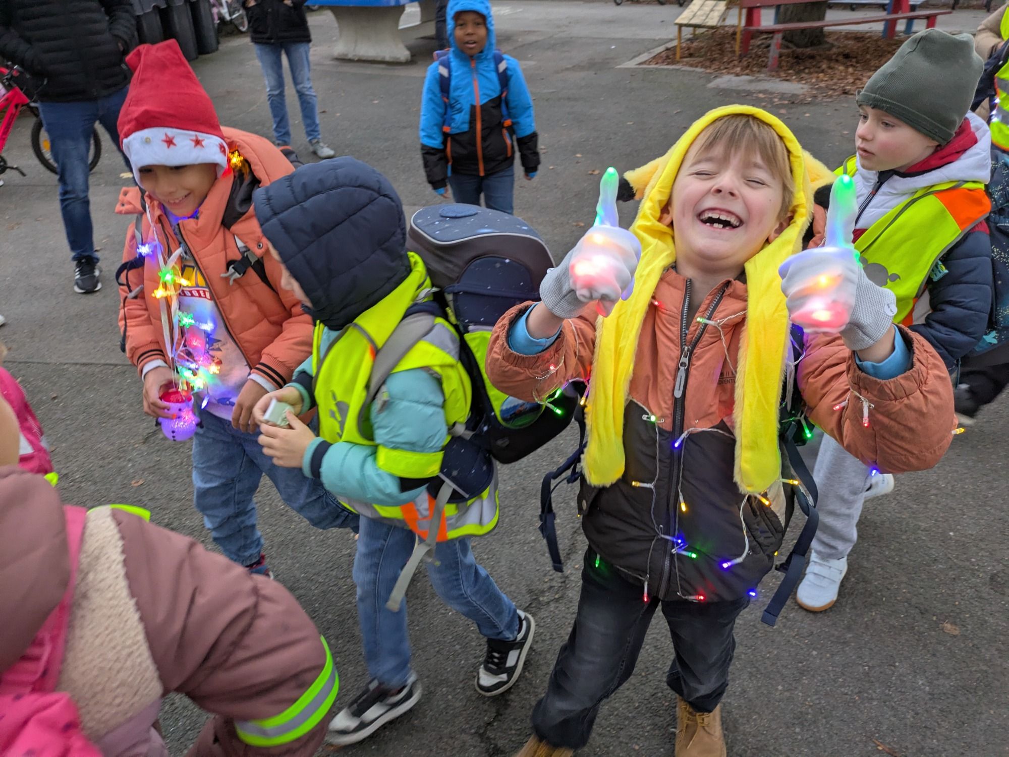 Wer am Freitagmorgen an der Diesterwegschule vorbeikam, konnte ein Lichtermeer bestaunen und die triste Jahreszeit für einen Moment vergessen. Viele Kinder hatten sich zu unserem Glühwürmchentag mit Lichterketten geschmückt und viele weitere leuchtende Gegenstände an Jacke, Mütze und Tornister befestigt. Die Kinder wurden auf diese Weise dafür sensibilisiert, auch in den nächsten dunklen Wochen darauf zu achten, den Schulweg gut sichtbar zu bestreiten um sicher an der Schule anzukommen.